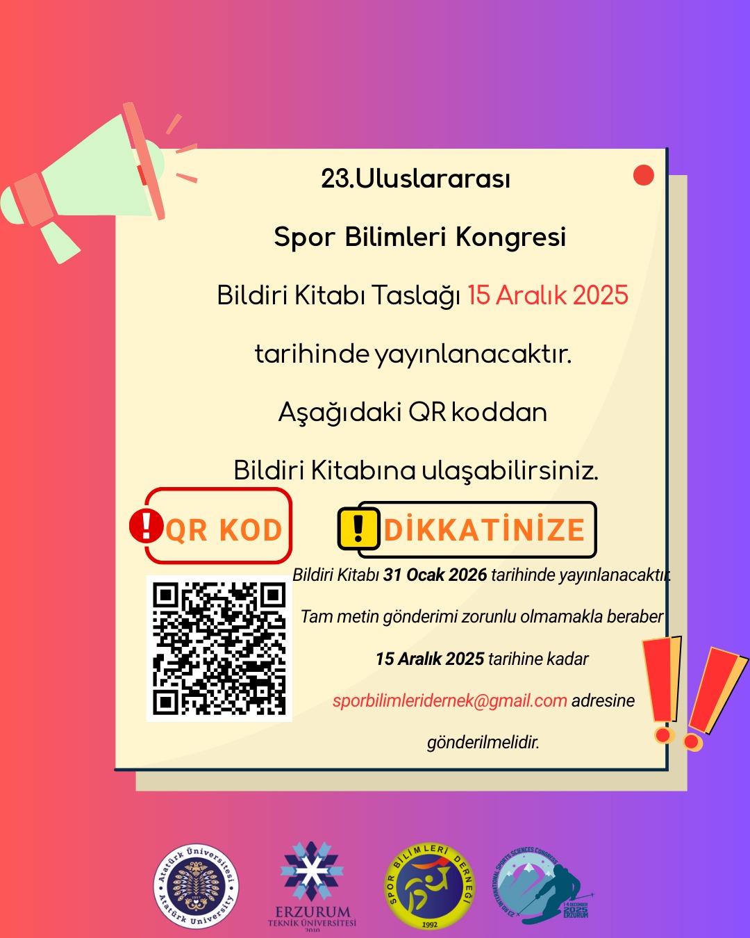 Spor biliminin güncel gelişmelerini paylaşmak, yeni fikirleri tartışmak ve ulusal-uluslararası iş birliklerini güçlendirmek amacıyla düzenlenen 23. Uluslararası Spor Bilimleri Kongresi web sayfasına hoş geldiniz.